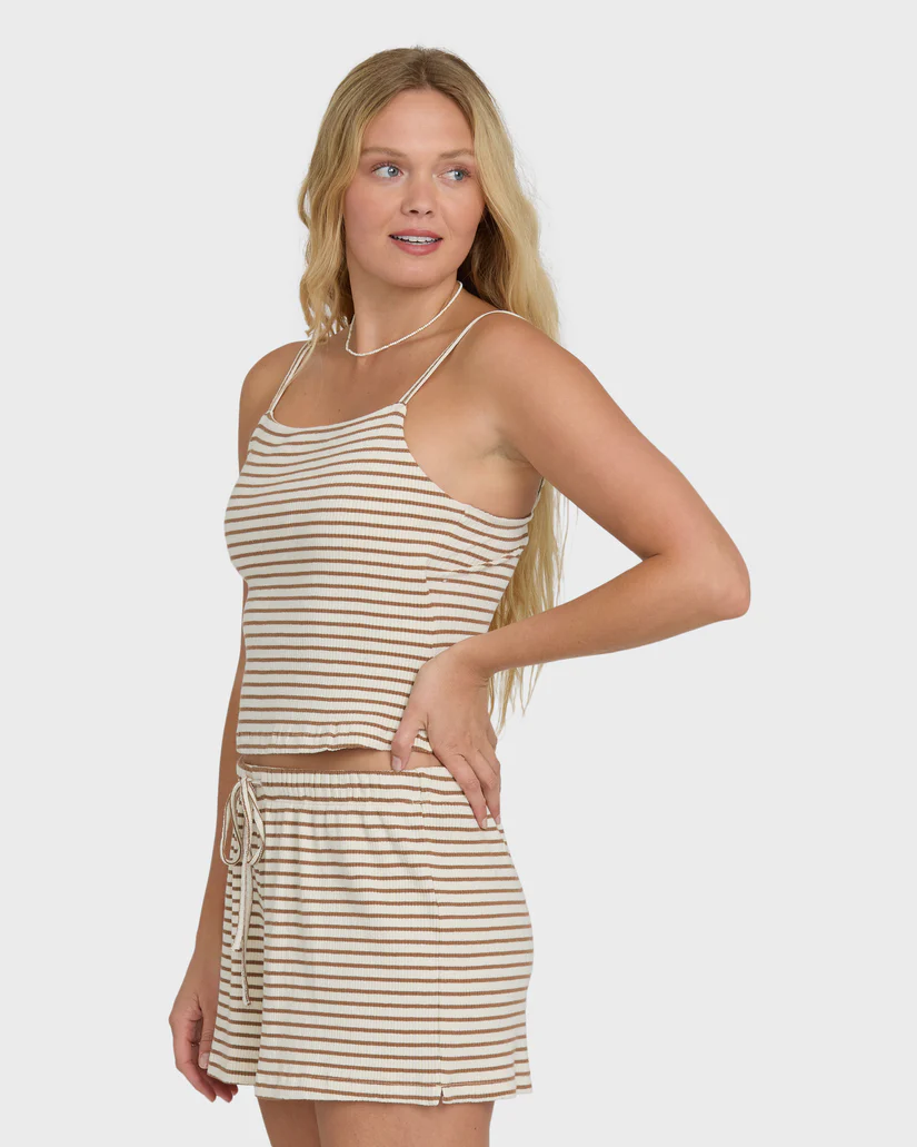 Easy Livin does the work for you. This fitted rib cami in Brown Stone hugs soft with stretchy cotton knit, a clean straight neckline, and skinny adjustable straps. An interior shelf bra adds light support, while the minimalist metal logo makes it easy to wear solo or layered on repeat. Featured here in the Brown Stone colorway.
