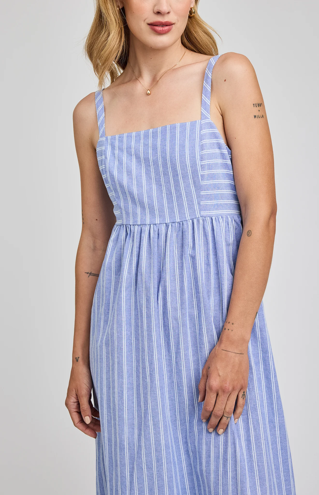 The Alicia dress is made of a cotton poplin with a yarn-dyed stripe. Features include adjustable straps and a back tie detail.