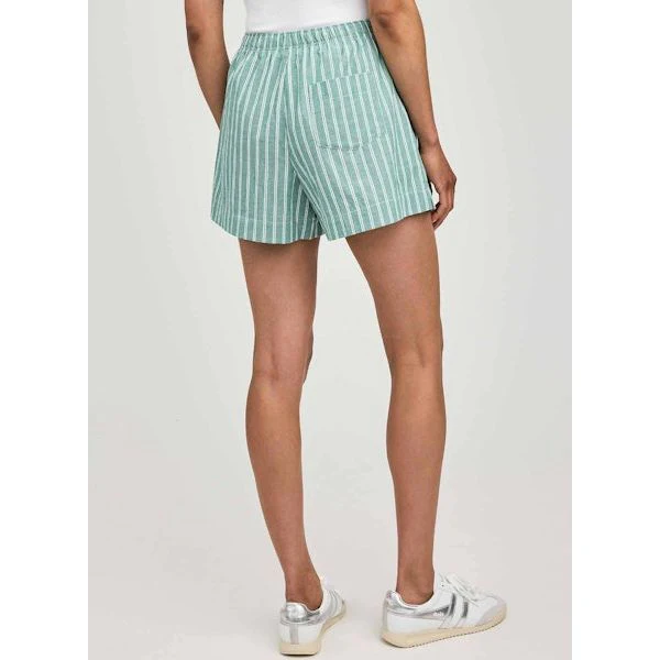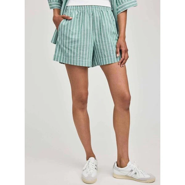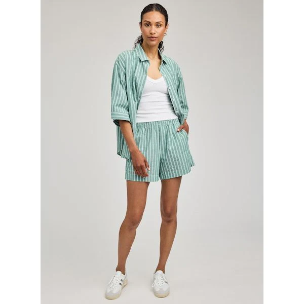 The Lima short is made of a cotton poplin with a yarn-dyed stripe. Features include slash pockets and an elasticated waistband with faux fly detail. Complete the look with the Blaire button down shirt.