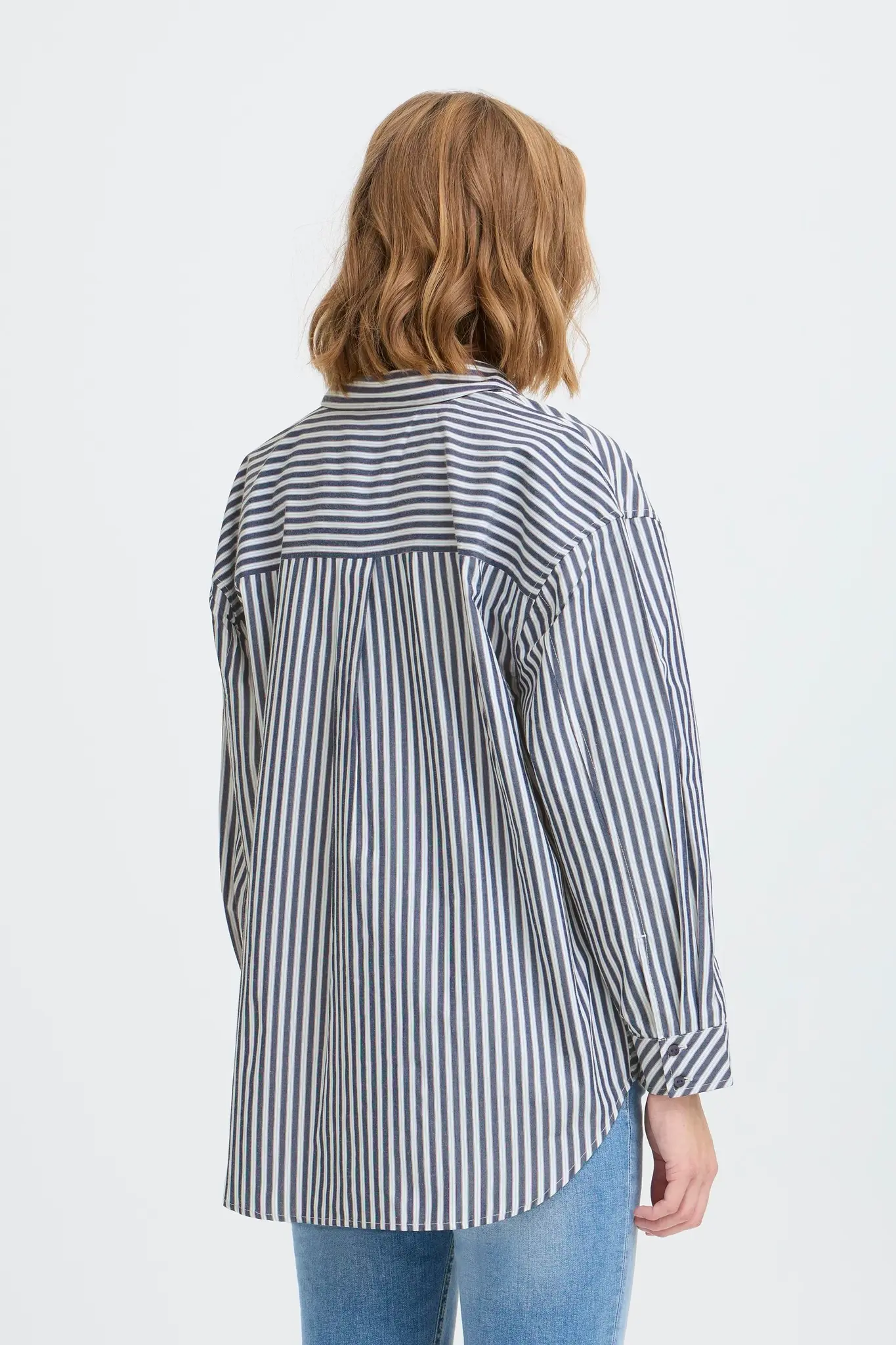 Striped oversized shirt features a button-down front, pointed collar, and a single chest pocket. Contrasting stripe directions add a modern twist to a classic relaxed silhouette.