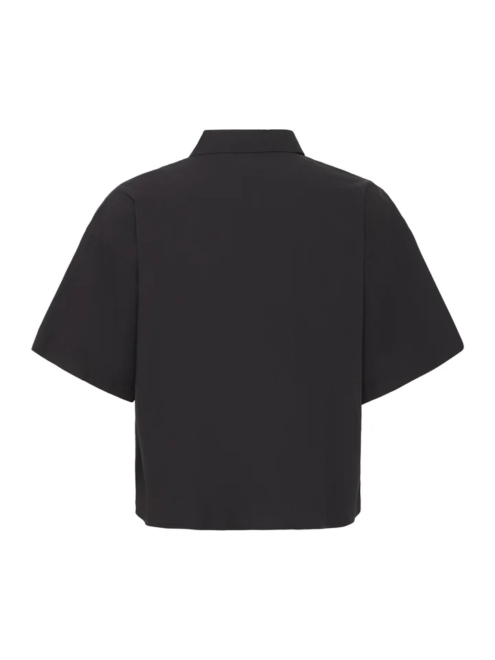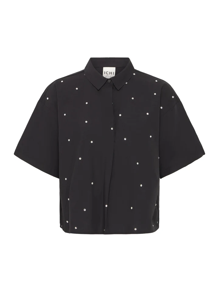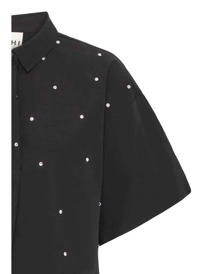 Meet the Lisari Shirt — a chic black short-sleeve style with a touch of sparkle. Designed with a subtle diamante pattern, it pairs a classic collared neckline with a relaxed, boxy fit for effortless wear. Finished with a neat two-button placket, it’s the perfect piece to dress up denim or add a little shine to your everyday looks.