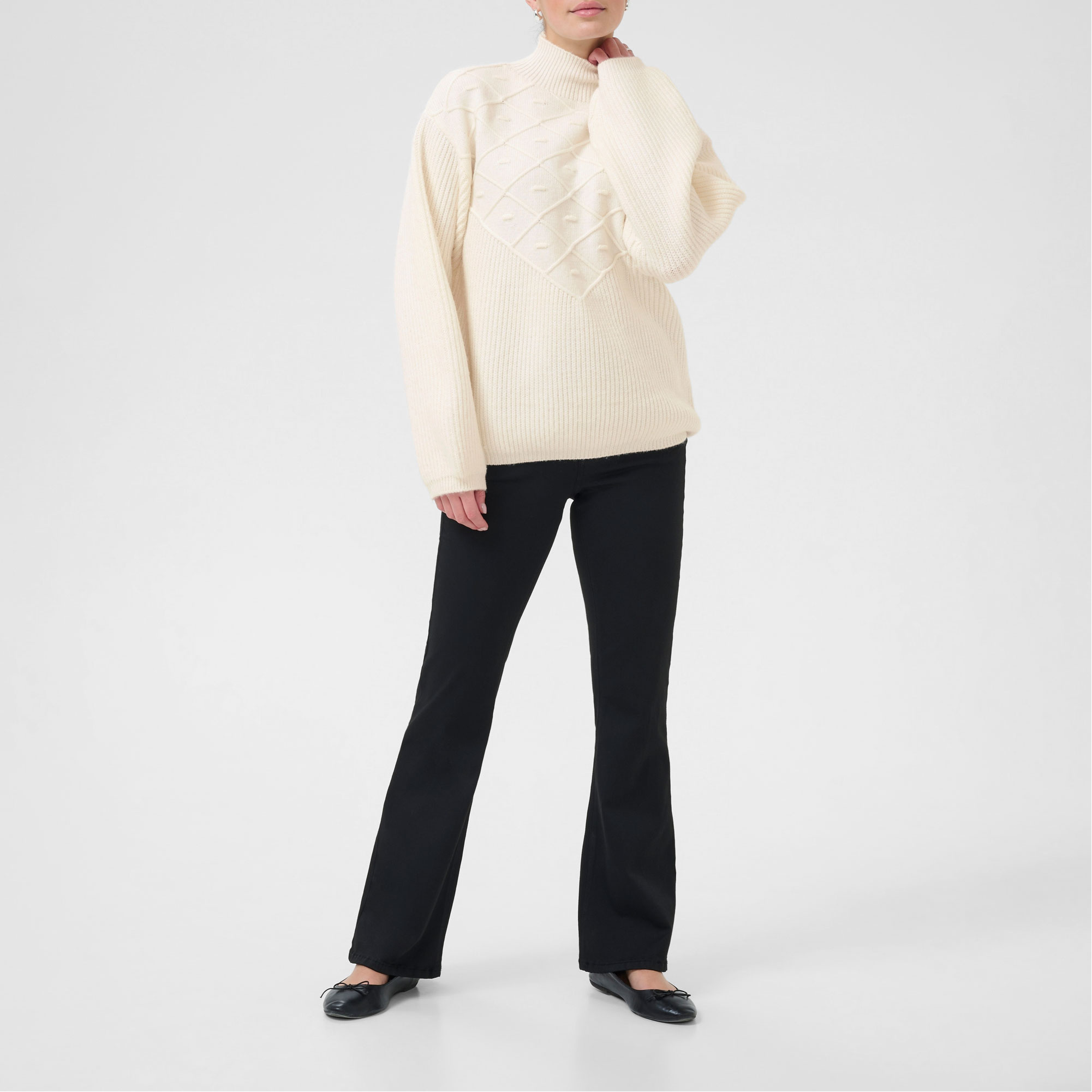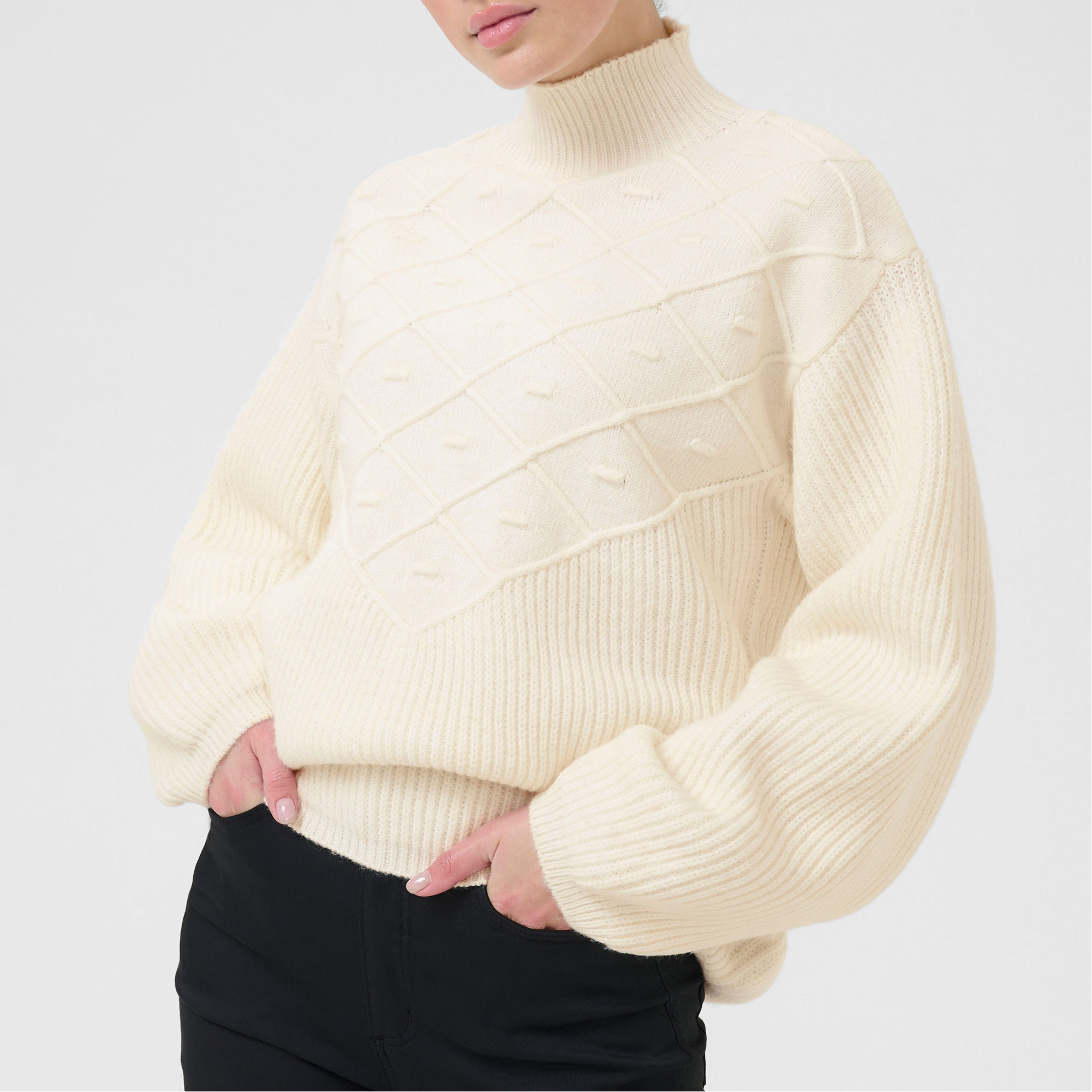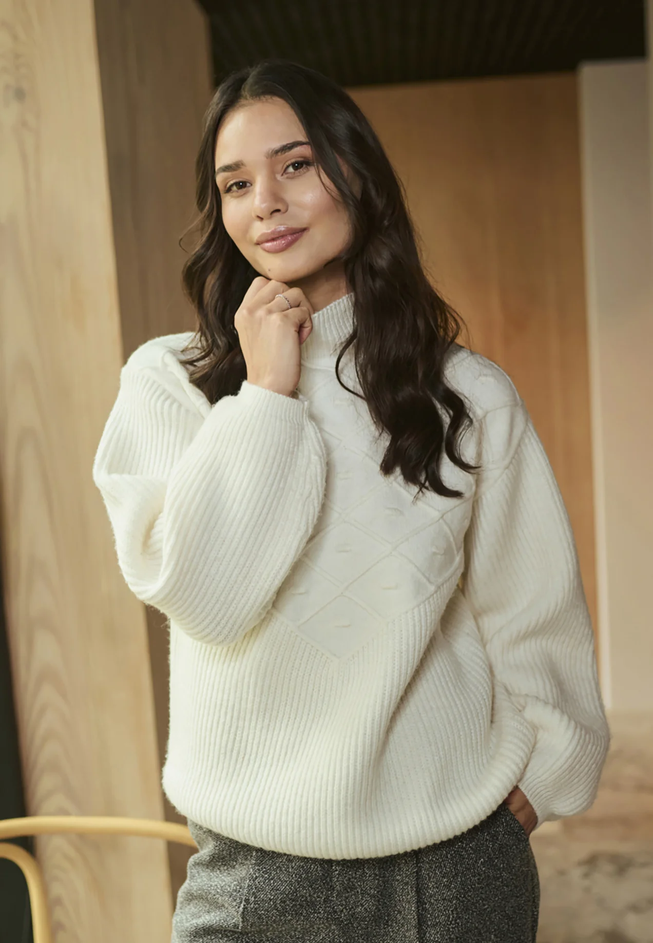 This women's pullover sweater features a relaxed fit and high neckline, offering warmth and comfort. Distinctive textured detailing at the front adds style, while long sleeves provide versatile wear for any occasion.