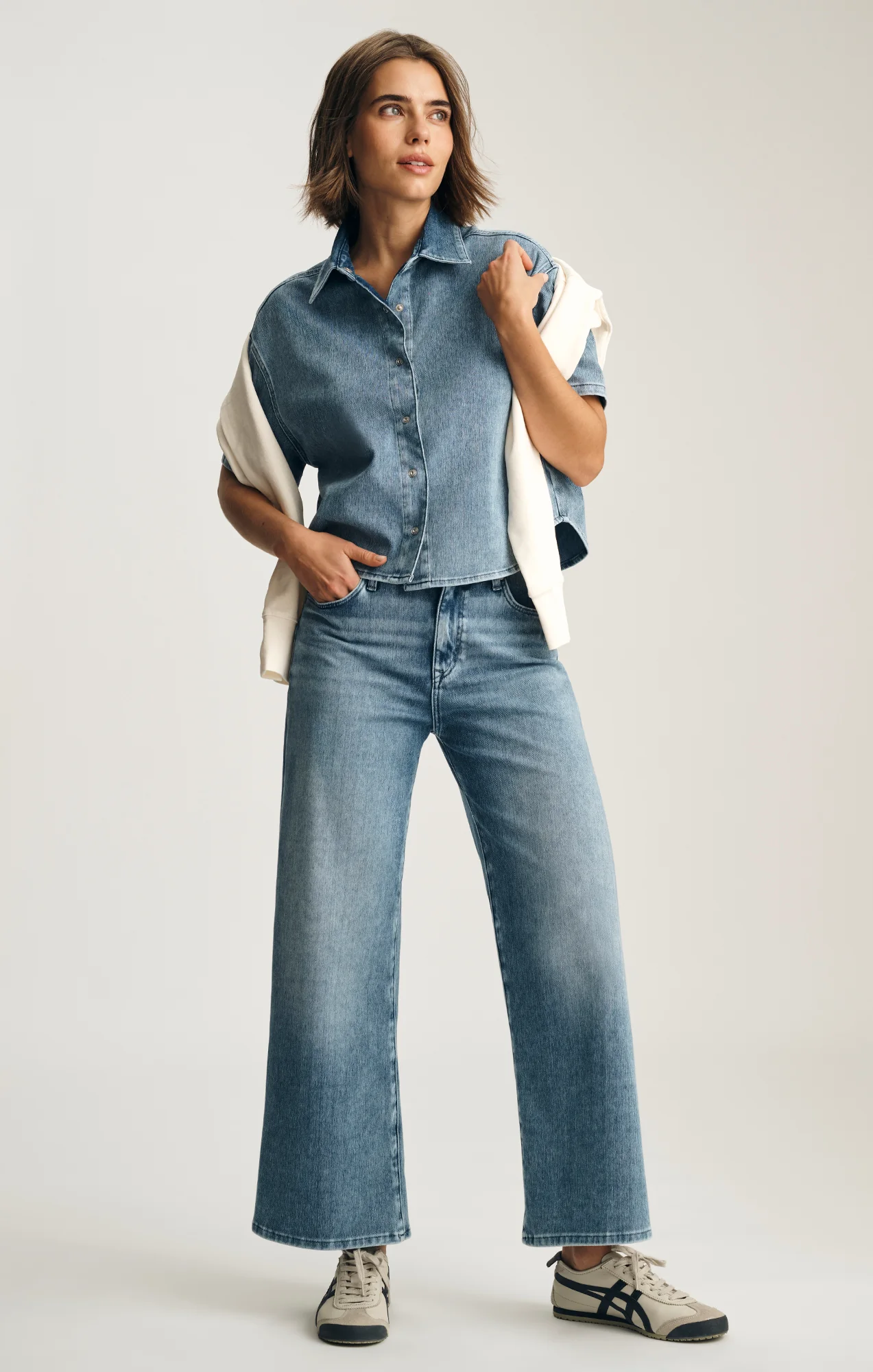 Paloma delivers a modern fit with a classic mid rise, flattering wide leg, and ankle-skimming length. This pair comes in a medium blue wash. Style with Jessie for a matching set.