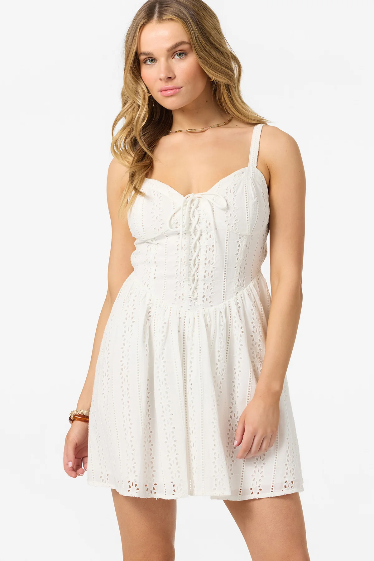 This mini dress combines comfort and style with its elastic neckline and smocked back panel. Crafted from 100% cotton eyelet fabric, it features delicate details like princess seams, a drawstring front and tiered skirt.