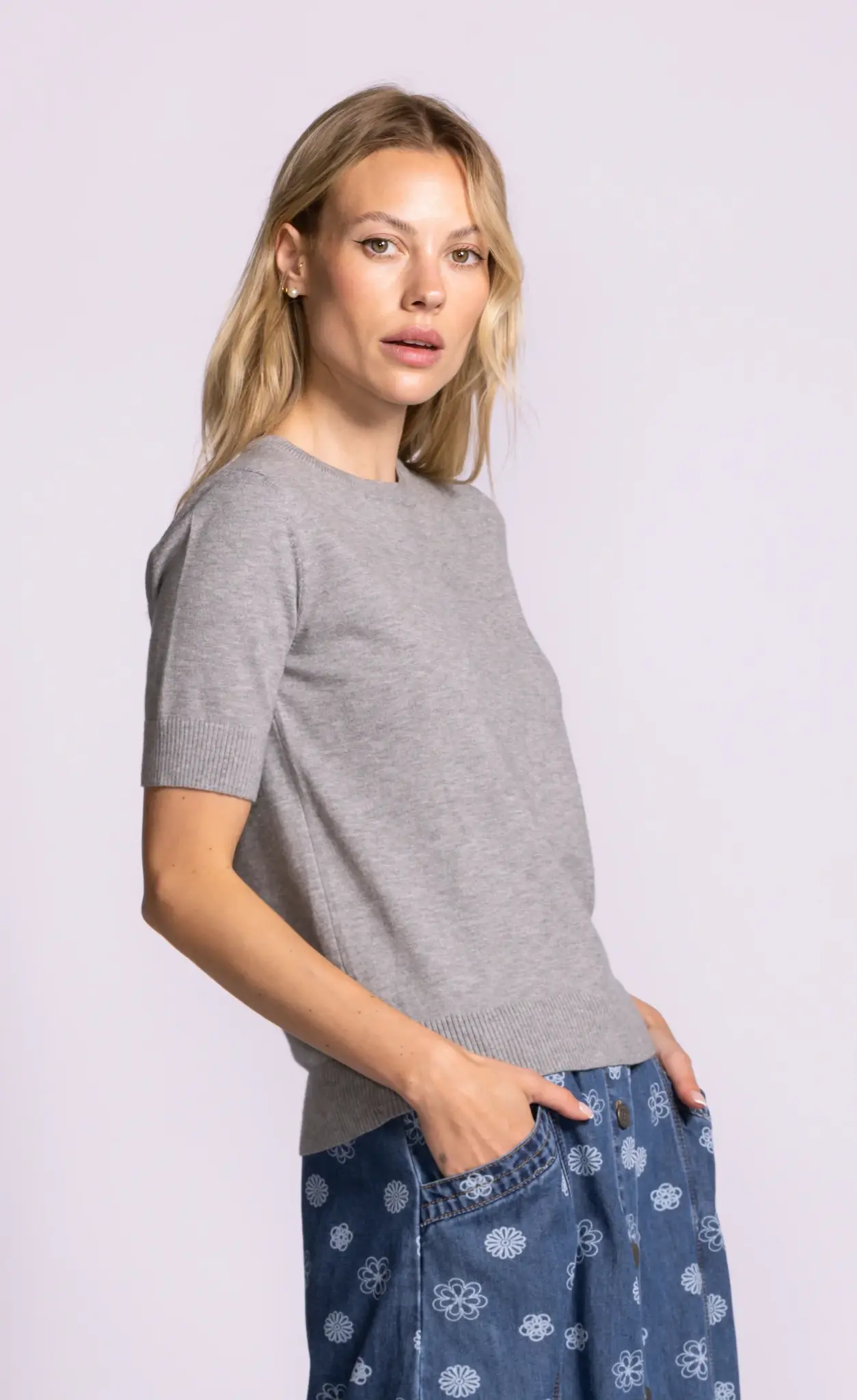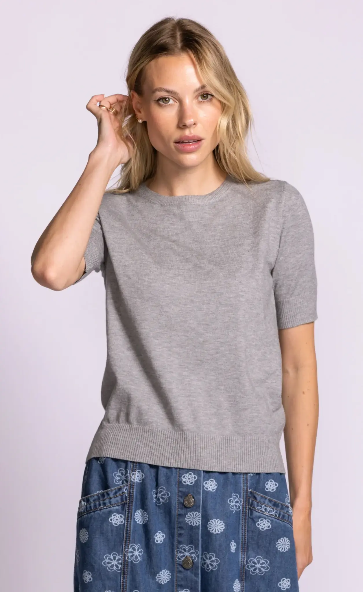 The Sandy Top is a soft knit basic with a round neck, short sleeves, and ribbed hem and cuffs. This short-sleeve sweater is designed with a relaxed fit. Simple yet super chic, style it with jeans or trousers for a casual workwear look.