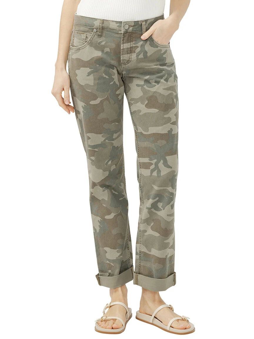 Laid-back and easy to love, the Chelsea Boyfriend Jean sits comfortably at the waist with a relaxed hip and thigh for that perfect borrowed-from-him fit. Designed with a mid rise, straight leg, and cuffed hem and a refined camo print.
