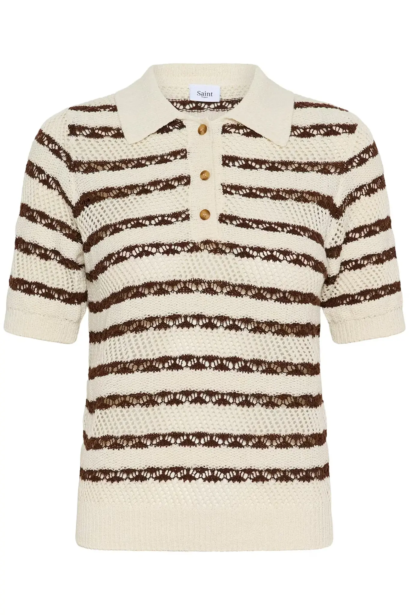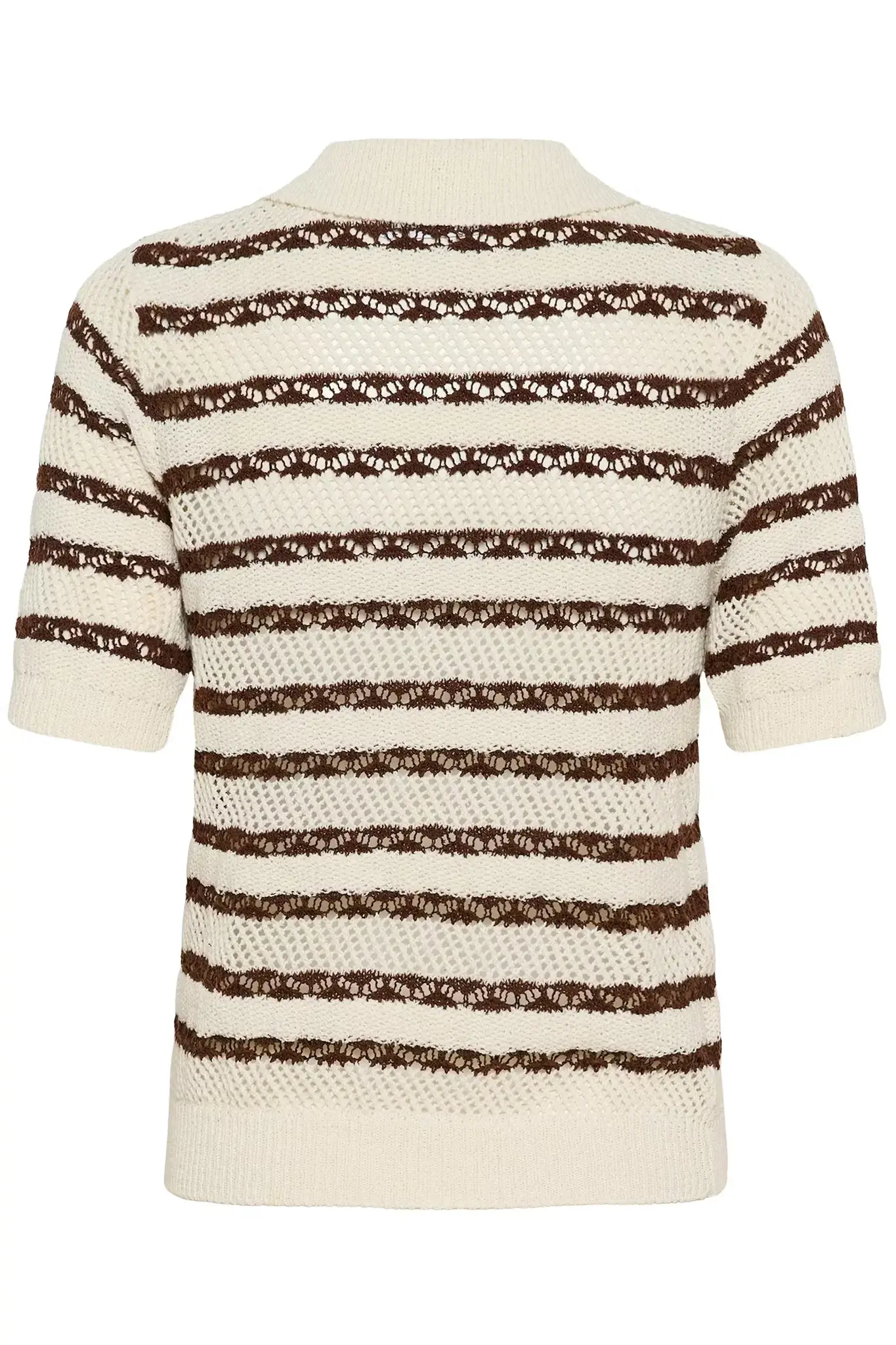 Knit polo shirt featuring a straight silhouette and short sleeves. Openwork horizontal stripes add texture. Finished with a flat collar, ribbed hem, and a front placket with four buttons.