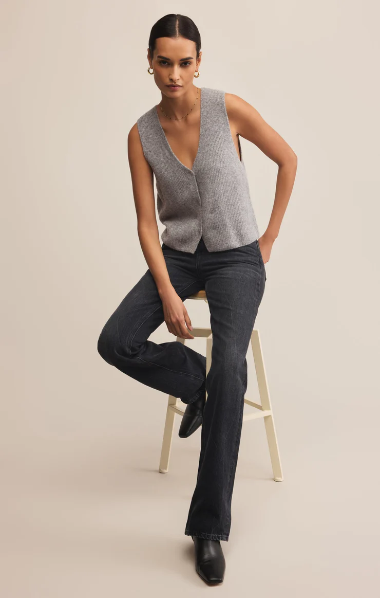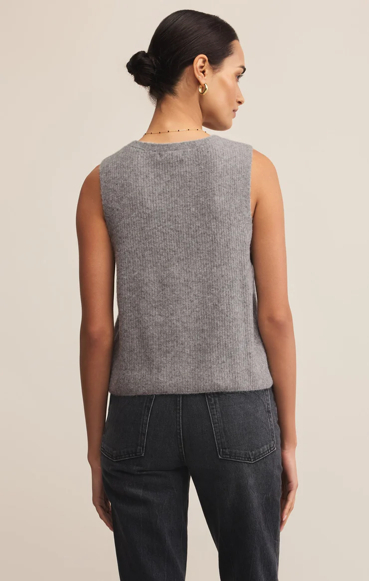 Designed in our soft Cozy Summer yarns, this sleeveless v-neck brings an airy weight and textured rib detailing. A standout piece that works solo in warm weather or layered as temps cool.