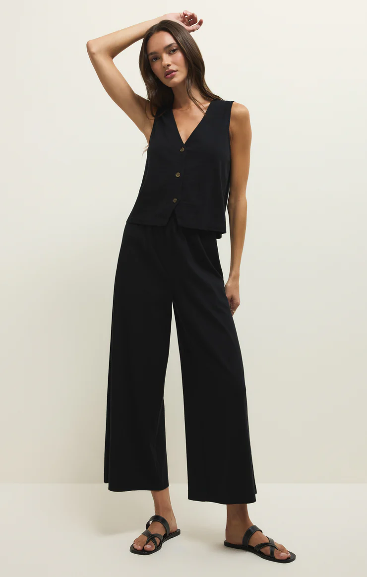 This pant is made with a 100% cotton jersey knit fabric and features a wide flare silhouette with an elastic waistband. This pant is a relaxed but stylish piece that looks so good with any of our everyday tops.